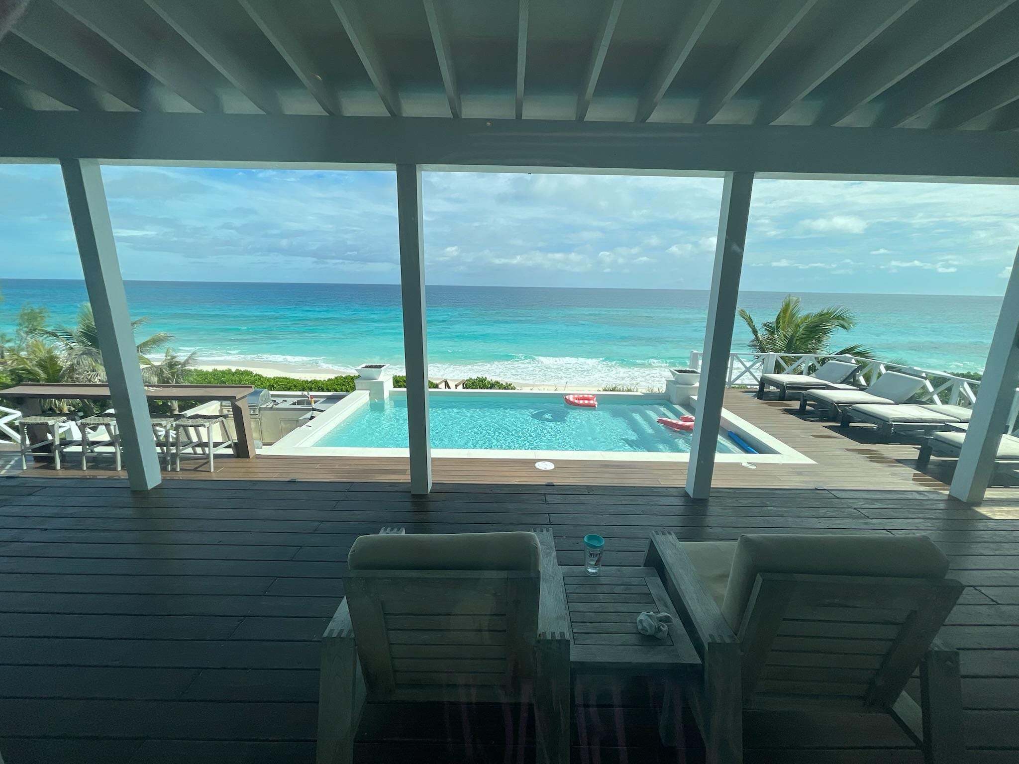 Wake up in the mornings and feel the breeze from the ocean through the open doors. Have a coffee on the private porch overlooking the Atlantic Ocean, while you go online and check the latest news and emails. The large deck on the Ocean side of the house comes with 4 lounge chairs, a bar area with stools, a first class propane barbecue, and an outdoor dining table. The living room opens up with sliding doors all around, with 3 doors facing the ocean and the large deck area. You'll probably be living as much outside as inside. Air conditioning units keep the house nice and cool while you are basking on the beach and in the sun. Large outdoor fans will cool you off while you are outside on the porch, when there is no wind.