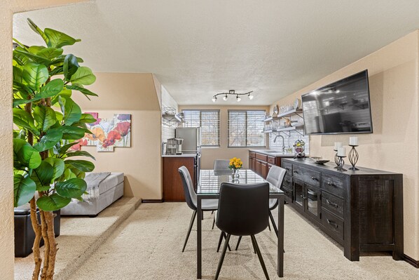 Unwind with our smart TV loaded with streaming services like Netflix, Disney Plus, and Hulu. You can sign into your own services if you'd like. Sink into relaxation on the comfy couch upstairs or enjoy a peaceful sleep in the upstairs bedroom's comfortable bed. For added flexibility, there's a pull-out couch downstairs with its own TV.