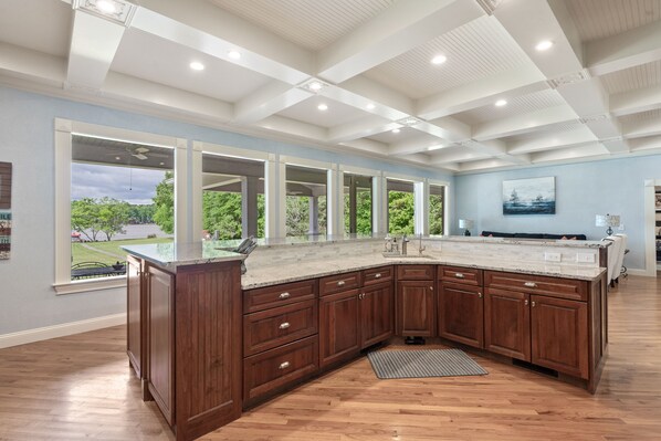 Når du kommer inn i den lange og skogkledde innkjørselen, vil du føle privatlivet og roen i denne majestetiske innsjøen getaway. Hovedetasjen har en åpen planløsning med et fullt spisekjøkken som åpner seg til en solrik stue samt en formell spisestue. Det inkluderer også hovedsoverom, pudderrom og vaskerom. Den store solrike mesteren har franske dører som vender ut mot terrassen med utsikt over innsjøen. Den har en king size-seng, walk-in closet og et stort privat bad med dobbel forfengelighet og dobbelt hodedusj. En vegg av vinduer gir utsikt fra nesten alle seter i huset.