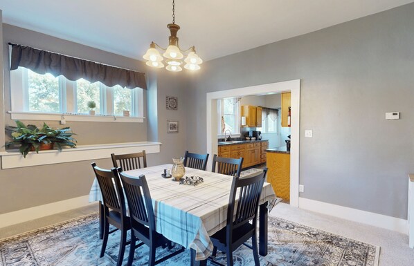 Welcome to The Beaumont Retreat, a charming and lovingly updated home in Greenville, IL, offering the perfect blend of comfort and convenience. The Beaumont Retreat features two private bedrooms and a full bath with a bathtub/shower, comfortably accommodating up to six guests. In addition to the bedrooms, the living room offers a sleeper sofa for added flexibility. The home boasts a fully equipped kitchen with a microwave, stove, dishwasher, full-size refrigerator, and coffeemaker. It also includes all the essentials for meal preparation, such as utensils, pots and pans, plates, bowls, mugs, and glasses. The dining table accommodates six, making it ideal for family gatherings or group meals. You'll also enjoy the ease of having in-unit laundry and off-street parking for two vehicles. The large yard and inviting front porch, surrounded by the lush greenery of Greenville, provide ample space to relax and unwind.