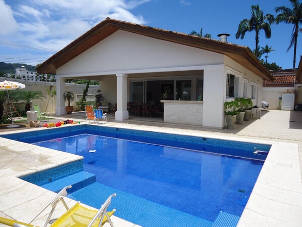 Hus, omtrent 350/400 meter fra stranden, i nærheten av de beste restaurantene i Guarujá, overvåket sikkerhet, 3 suiter, senger for 12 personer, stue (med LCD-TV 46, bredbånd trådløst internett, betal-TV NET), komplett kjøkken (alt tilbehør), balkong med lunsjbord, lenestoler, lang sjesel, gourmetplass (komfyr, stekeovn, grill, vask, benkeplate), basseng med dekk, plenhage med frukttrær, garasje for opptil 5 ( fem) biler, med port med automatisk aktivering. Del klimaanlegg i alle miljøer. Vaskerom utstyrt med vaskemaskin, to tanker, to bærbare klessnor og en fast. Innsjekking fra kl. 07.00 ANKOMSTDAG OG CHEK-OUT UTEN 21.30 AM. AVSLAGSDAG. Se FLERE DETALJER NEDEN FOR BEREGNING.