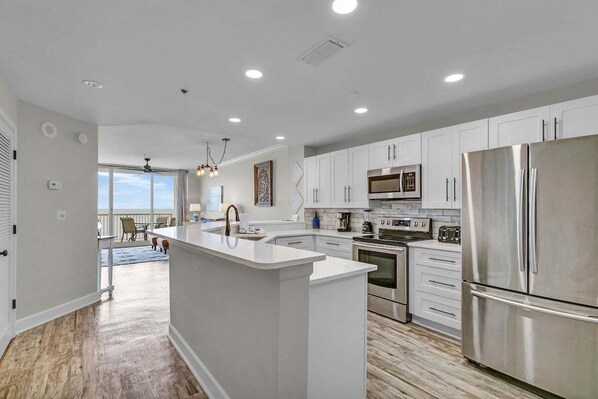 Luxurious features include a fully equipped gourmet kitchen with gorgeous quartz countertops and stainless appliances. This opens into the gulf-front dining and living areas, complete with a full-size sleeper sofa, a large TV, and balcony access. The oversized balcony, furnished with a table and chairs, offers breathtaking views of the pristine white sandy beaches. Additionally, the unit includes a washer and dryer, as well as wireless internet access.