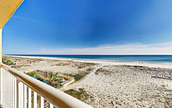 Denne leiligheten i tredje etasje, 2BR / 2BA Gulf Shores, er en del av de populære Driftwood Towers. Det er blitt totalrenovert med beachy detaljer som perlebrettvegger og nye fliser på gulv. Og utsikten kan ikke slå! Mexicogulfen strekker seg foran deg fra den private balkongen.