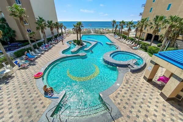 Access to multiple outdoor pools, lazy river, sun deck, and hot tubs