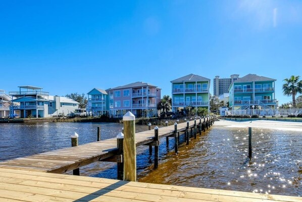 This 5-bedroom house is situated in a family-friendly area of West Beach, Gulf Shores. It’s the best of both worlds—close to great restaurants and activities but far from the hustle and bustle. Our cozy cul-de-sac on Little Lagoon has just 11 homes, a pool, and a fishing pier. The covered pier is perfect for watching sunsets and spotting wildlife.