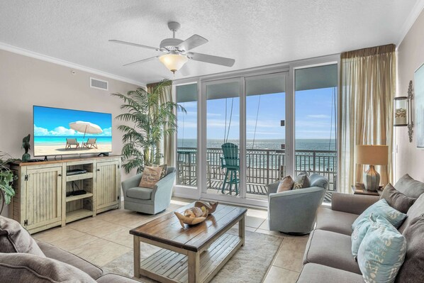 The open living area features floor-to-ceiling windows with Gulf views, comfortable seating, and additional sleeping space with a sleeper sofa and loveseat with a pull-out. The dining table seats six, with additional seating at the kitchen bar. The fully equipped kitchen includes full-size appliances and a mini-bar area, making it easy to prepare meals or unwind after a day outside.