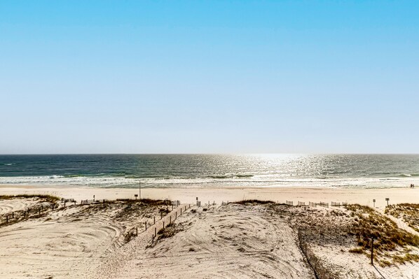 You'll find everything you need to prepare and enjoy meals in your fourth-floor condo's well-equipped, full kitchen and dining area, but if you enjoy cooking and dining outdoors, a grilling area is also located on-site. This condo features its own private balcony giving you the option to extend your living space outdoors, watch the sun rise and set each day, or relax to the sounds of the surf, gulls, and happy families playing below.