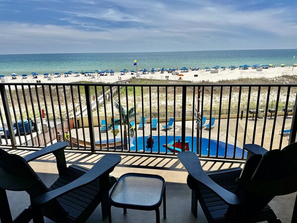 Denne vakkert dekorerte 2BR / 2BA beachfront leiligheten har vakker utsikt over stranden fra en stor balkong! Denne leiligheten har alt du trenger for en behagelig og hyggelig ferie. Du vil elske den vakre utsikten fra både stuen og hovedsoverommet! Både master og stuer har skyve glassdør innganger til golfen foran balkongen, utstyrt med et uteplass bord og stoler. Du vil nyte å hygge deg med morgenkaffen eller ha et glass vin ved solnedgang på balkongen mens du tar den vakre utsikten over Mexicogolfen.