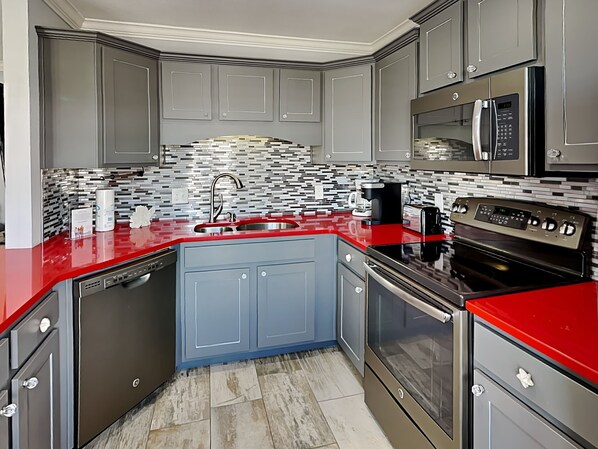 Step inside to be greeted by a bright, open floor plan that will put you in a good mood instantly. The living room offers comfortable furniture and a flatscreen TV making it a great place to relax after a long beach day. The dining area offers seating for four with additional seating at the breakfast bar overlooking the well-appointed kitchen. The kitchen boasts quartz countertops, stainless steel appliances and a Keurig for the hot beverage lovers in your group.