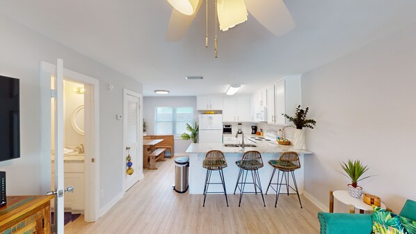 Step inside and unwind in a vibrant emerald-green retreat, where plush sofa and a TV invite you to relax and feel at home. The fully equipped kitchen has everything you need, including a coffee maker, blender, and microwave for easy meal prep. Enjoy meals together at the dining area with seating for 5, plus 3 additional bar stools in the kitchen perfect for casual meals. There’s also a half bathroom downstairs for added convenience. Upstairs, you’ll find two cozy bedrooms: the Queen bedroom with a private balcony overlooking the pool, and the second bedroom with a twin-over-full bunk bed with trundle, ideal for kids or extra guests. Both bedrooms share a bathroom, offering convenience for all guests.