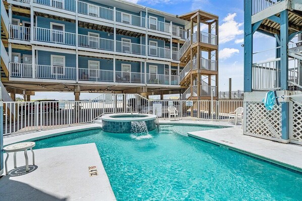 We chose this property because it was right on the beach and had a pool. The pool is small but was great for our kids ages 7 and 12 to have a break from the beach. The condo was clean and had everything we needed. I would stay again!