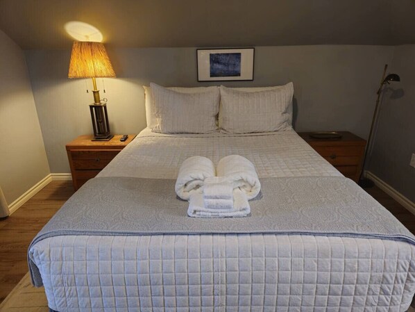 Sleeping Arrangements: Features a comfortable queen bed in the upstairs master bedroom with an ensuite bathroom. Downstairs you will find a cozy bunk room with a queen bed on the bottom and a twin XL on the top bunk) perfect for children or additional guests.