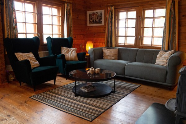 Huset er et ekte tømmerhus av heltre bjelker; en 'Finn tømmerhytte' på ca. 80 kvm for 4 + 2 personer. Et kjæledyr er selvfølgelig tillatt. Oppsettet består av en stue med høyt tak på taket og en flatskjerm-TV (inkludert satellittkanaler), åpent kjøkken, to soverom, et bad med dusj, toalett og vaskemaskin; og et ekstra soverom for to spennende på loftet med innebygde senger. Vi har hatt WiFi i 1 år nå.