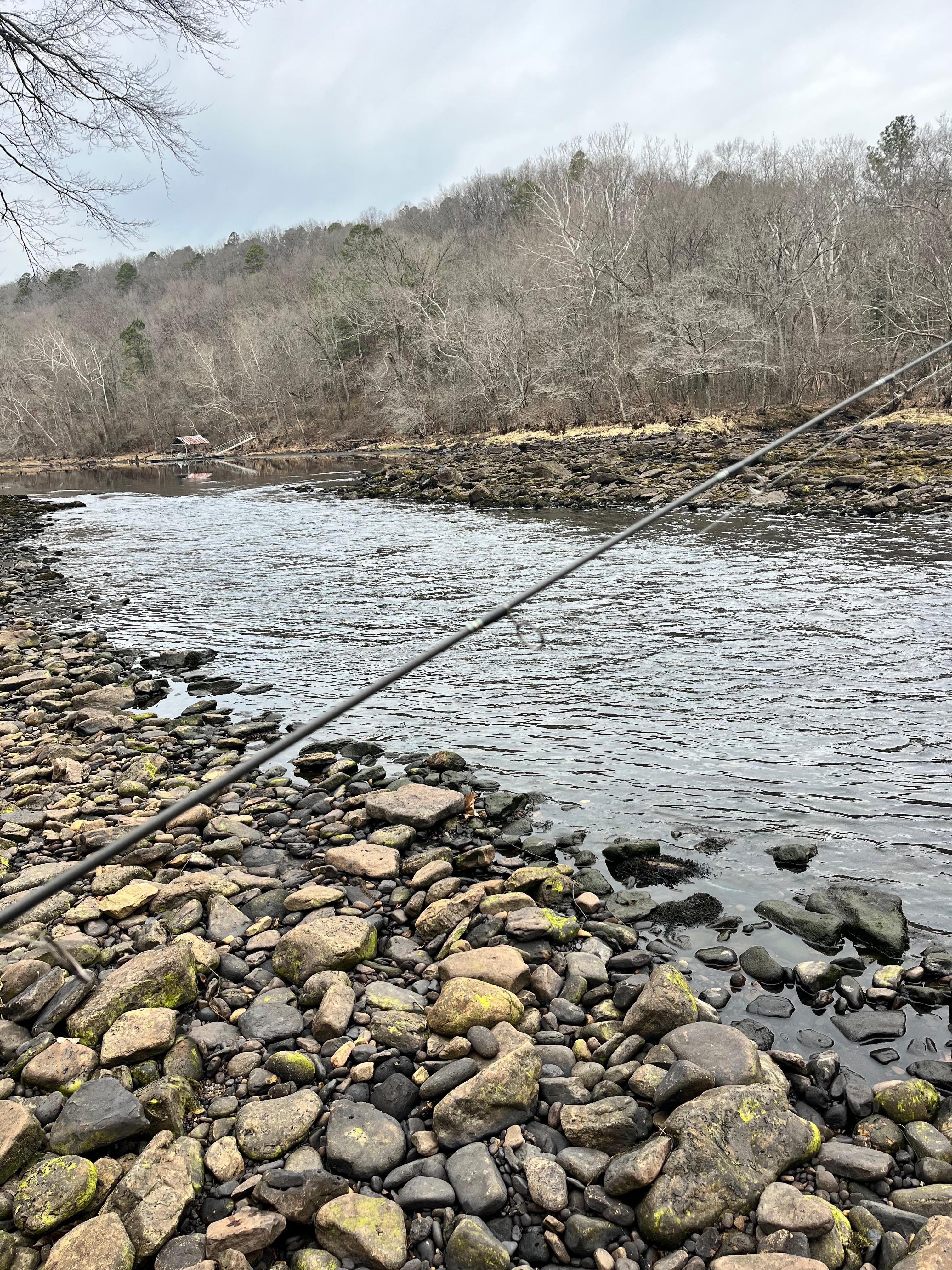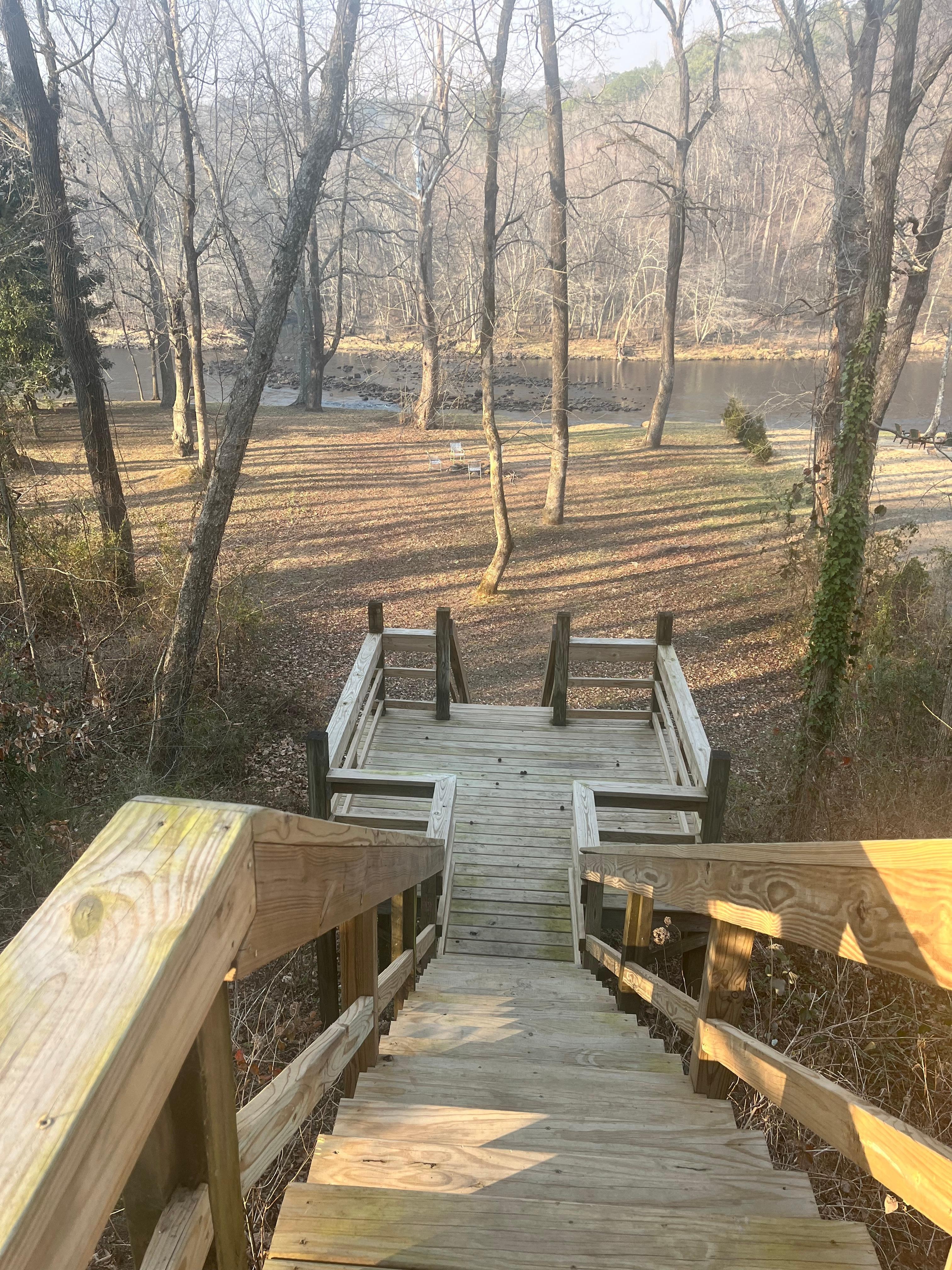 Steps and platforms meander down from the cabin's woodsy back deck to the banks of the river. There is a large cleared area between the deck and river. It’s perfect for driving down the access road to fish right from your tailgate, with a small campfire ring, and open room to play for little ones. The world record German Brown Trout was caught within a half mile of the cabin at cow shoals at over 40 pounds and boat rental and fishing guide service are available right down the lane. Excellent fly fishing opportunities abound. With boating lane at our bank, and a rocky shoal leading all the way across to the river’s opposite shore, you have prime conditions for dam release levels or low water wading. Make certain to view pictures of lunker trout caught by 2011 guests within one-mile of the cabin, at Cow Shoals.