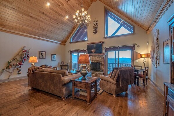 Denne luksuriøse hytta har et fullt utstyrt kjøkken for flotte familiesammenkomster og en nydelig hvelvet stue med gulv til tak-vinduer. Stuen fører til et stort dekk med utsikt over den fantastiske utsikten! Nyt utendørs med stoler å slappe av i, et utendørs bord for bespisning og grilling på bensigrillen.