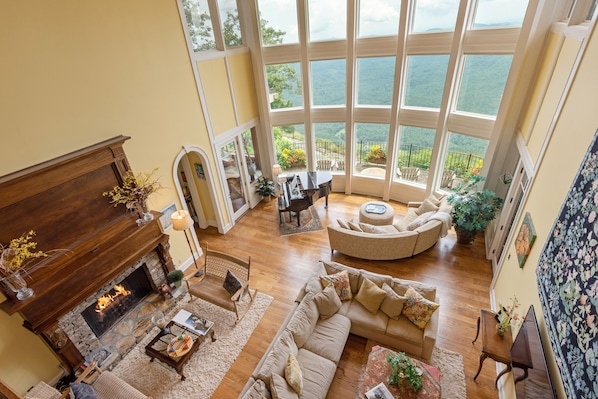 Cozy up to the fireplace in the living room while admiring the long-range mountain-views through its two-story-high wall of windows. A well-equipped chef's kitchen and dining room are just steps from the living room and the four-season room. Venture out onto the uncovered porch for some sunshine and enjoy the uninterrupted vistas. Wake up in the primary bedroom suite located on the upper floor, with a king bed, fireplace, large screen tv, wet bar, and jetted tub. Also on the upper level is queen bedroom with sweeping views and ensuite bath. On the main level there are two bedrooms. One with a queen bed and sliding doors, with a walk out to the adjoining four-season room to enjoy your morning coffee. The other is an additional queen bedroom and bath, which offers a fireplace and clawfoot tub.