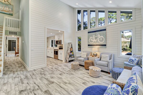 Upon entry, you walk into the sitting room, which has plenty of comfortable seating around the cozy brick fireplace (not for guest use). Soaring ceilings and many large windows produce a light and airy environment that all guests will enjoy relaxing in. A huge, tastefully decorated living room right around the corner features a large sectional and flatscreen TV, along with lush nature and pool views that surround you through the huge windows and glass doors. Enjoy the comfort of a completely stocked kitchen to help make your morning brunch or beach snack preparation easy. Plenty of counterspace and brand new appliances allow for a seamless culinary experience. The dining table sits next to the fireplace and has enough seating for 7.