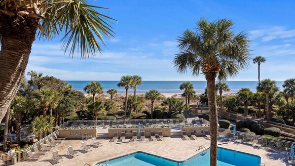 Balkong terrassen med 4 stoler og bord har fantastisk utsikt over havet samt bassenget, perfekt for kaffe eller cocktailer! Nede ved Captains Walk-bassenget (oppvarmet fra 3/1/4/30 og 10/1 - 11/30) er griller for cookouten din (ta med kull) og så er det bare en rask tur til stranden.