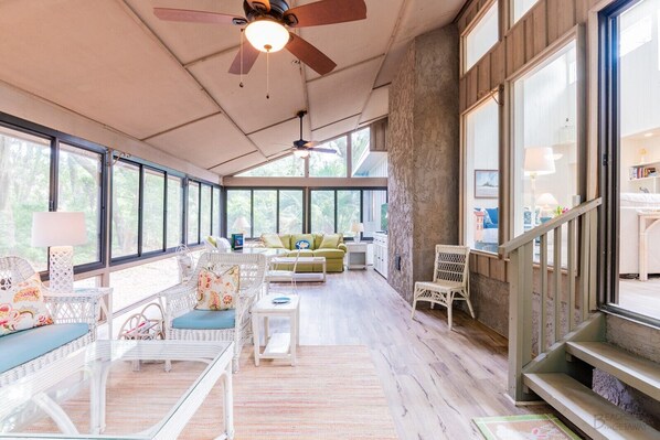 Enjoy relaxing together in the great room with plenty of comfortable seating and a large flatscreen, smart TV. The dining area has seating for up to eight guests and lots of natural light shining through! Just off the great room is the spacious Carolina room. The Carolina room is enclosed with lots of windows with landscape and lagoon views! There is another dining area, as well as plenty of seating to watch TV, play a game or create a puzzle in this wonderful mix of indoor living with an outdoor feel!