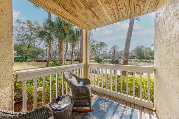 This villa is on one level, but you must go up 5 steps to get to the main entrance where you are greeted by a courtyard. This is the perfect space to leave your beach gear or golf equipment! Inside, you will find LVP flooring throughout and beautiful finishes. It was remodeled with your perfect vacation in mind. The kitchen is fully stocked and features stainless steel appliances. The laundry room is at the back of the kitchen with a full-size washer and dryer. Guests can either dine at the kitchen peninsula or gather around the dining room table. The living room is the perfect space to gather and watch your favorite movie on the smart TV, play a game or watch the golfers! The sectional sofa converts to a queen-sized sleeper sofa for additional sleeping space. Outside, the patio is a great spot to relax and enjoy the coastal breeze with a lagoon and golf course view! Bedroom 1 features a queen-sized bed, and ensuite with a walk-in shower. Bedroom 2 features a king-sized bed, and ensuite with a shower/tub combo. Traveling with kids? A pack-n-play and high chair are available for guest use! Book your next Hilton Head Island vacation at 161 Colonnade Club.
