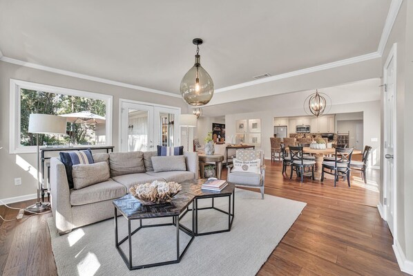 Features of this Ground Level Home include an open floor plan consisting of a Main Living Room with 55" flat screen TV, Dining Room, Updated Kitchen and a Family Room with flat screen TV & Wine Cooler. Down the Hallway you will find 3 Bedrooms & 2 Bathrooms. The Master Suite is furnished with a King bed, Flat Screen TV & Private Bath with Shower. The Master Suite offers serene views of the Private Pool with lush landscaping. Bedroom 2 & Bedroom 3 are each furnished with Queen beds and share a Hall Bath with a Tub/Shower Combo. The Bunk Room; which is ideal for children, is located off of the Kitchen Area. The Bunk Room offers 2 Bunk Beds, a 50" Flatscreen TV plus an assortment of games, & coloring books for your children to enjoy. Beach Towels & Beach Chairs are included in every Hilton Head Rentals professionally managed property.