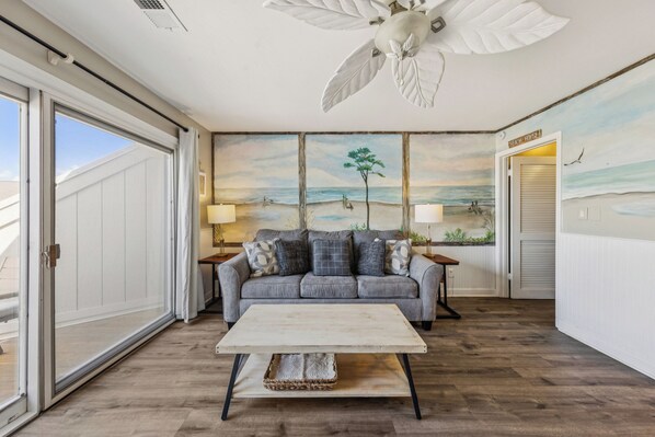 The living room features a queen-sized sleeper sofa, dining table that extends for additional seating and kitchen. The kitchen features stainless steel appliances with granite countertops and 2 barstools for additional seating. Guests can relax and watch TV or head out to the balcony to take in the spectacular ocean views.
