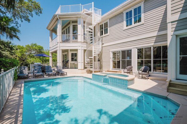 Få pusten fra deg! Nyt spektakulær utsikt over havet og fantastiske solnedganger fra praktisk talt alle rom i dette 7-roms, 8-roms, andre rad privat hjem som ligger i en rolig gate i North Forest Beach. Hjemmet er designermøblert og påfallende dekorert overalt. Gjester som kommer inn i hjemmet på 1. nivå vil finne biljardrommet: det perfekte stedet å utfordre motstanderen til et bassengspill. For de som ønsker å lene seg tilbake og slappe av, bare noen få skritt opp til hovednivået i hjemmet, vil du glede deg over alle bekvemmeligheter mediarommet har å tilby! Utstyrt med surroundlyd og en stor flatskjerm-TV, kan du glede deg over din favorittfilm eller sportsbegivenhet i luksus. Legg føttene opp og slapp av med en god bok i hjemets rolige stue med utsikt over bassenget, som også ligger på dette nivået av hjemmet. Bare noen få skritt opp til 3. nivå er det store gourmetkjøkkenet, komplett med to ovner, en kokkens drøm! Kjøkkenet åpner for et stort stue og spisestue. Soverommene (ligger på 2. og 3. nivå) er satt opp med en konge mester, 2 konge gjester, 2 dronning gjester, og to soverom med 3 fulle senger. Hvert soverom har sitt eget private bad. Dette private hjemmet er perfekt for komfortabel innkvartering til opptil 16 gjester. Dette hjemmet er utstyrt med heis for de som ikke ønsker å klatre opp trappen. I løpet av dagen kan du suge solen på det private soldekket der du kan nyte vidstrakt utsikt over stranden og Atlanterhavet! Avkjøl i det private bassenget eller slapp av i spaet. Bare noen skritt fra stranden og til Coligny Plaza. Med shopping, servering og underholdning er det uendelige måter å tilbringe dagene dine her! Vi ser frem til å se deg på stranden!