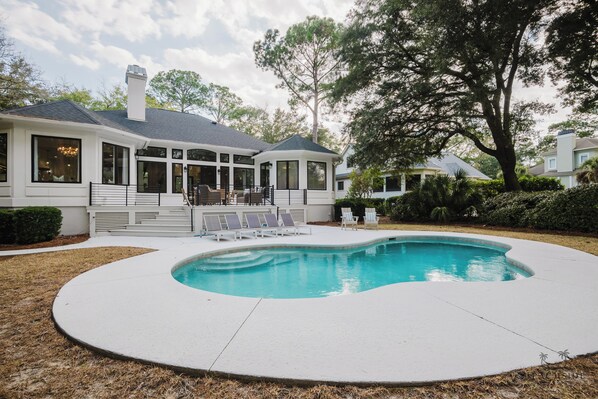 Enjoy the large back deck that leads down six steps on either side of the deck to the pool deck and lush backyard with a private saltwater pool (pool heat additional cost) and a three-burner gas grill. The beach is just a leisurely 10-12 minute walk and you also have access to the complimentary Palmetto Dunes Beach Buggy when in season (April to September).