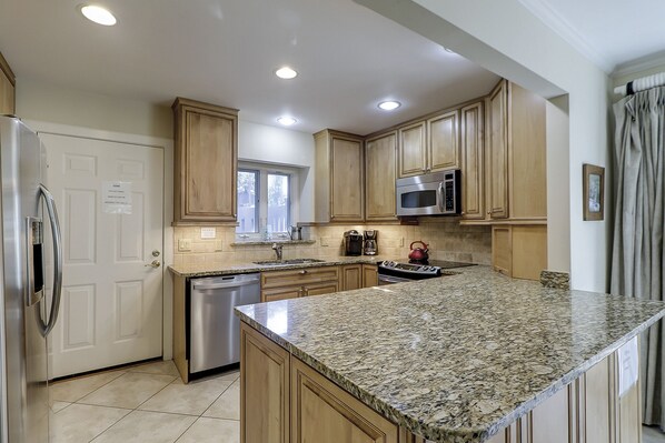 The first thing you will notice upon entry is the enormous picture window overlooking the lagoon. The oversized living and dining room are the perfect hang out area for your family. The living room features queen sleeper sofa and a love seat looking out over the water. The dining room seats six and through the sliding glass door leads to the grill area and a path down to the dock. The kitchen is fully updated with granite counter tops, plenty of cabinet space and new stainless steel appliances. The kitchen also has a stackable washer and dryer as well as an entry door that leads to the service yard.