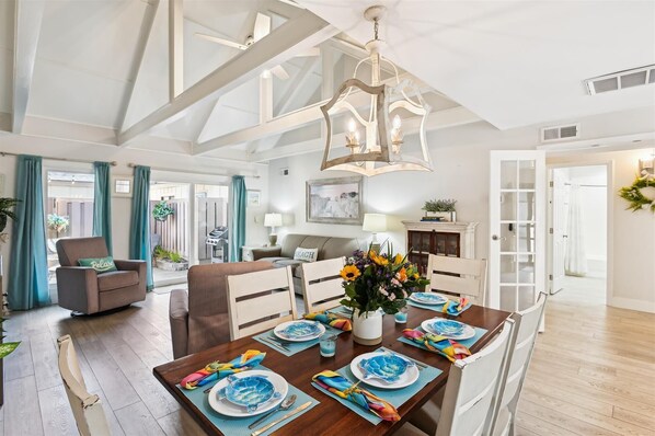 ✓ Spacious dining area with seating for six, plus additional seating for three at the kitchen bar