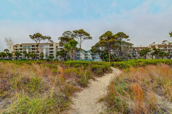 Very convenient location to beach and Coligny. Small property - nice pool on the way to the path of the beach. Condo on top floor - peaceful - plenty of towels provided as well as toilet paper. We loved the balcony. We enjoyed watching the crows, listening to the music from the tiki hut, counting monarch butterflies and marveling at the independent local cats down below. Condo could use updates - TV options were cable or a DVR (it rained everyday of our trip) Beds were very comfortable! Kitchen well equipped with items but for us, missing a cutting board and oven mitts for cooking. An early check in of 2:30 was declined via phone call - even though space was empty and cleaned. Incorrect entry code for VRBO was given via email - delayed entering condo and had to remember a 9 digit code to enter condo each time. Laundry is available outside the unit, but it is 1 in quarters to wash and 1 in quarters to dry. Had to go to local bank on the island to “buy” a roll of quarters with cash only. Bring quarters if you plan on doing laundry!Overall a nice option - great location - view of ocean and quiet.