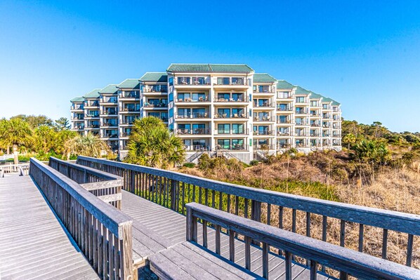 For those who want to be on the beach quickly, simply go down the back stairs and the beach walkway is right there. You don't have to hassle with the elevator but it is there if you need it. Enjoy a stroll through the beautiful landscaped grounds, over the elevated beach boardwalk and your toes are in the sand!