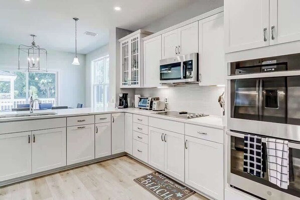 * Chef’s kitchen with quartz countertops, double ovens, and a gas range