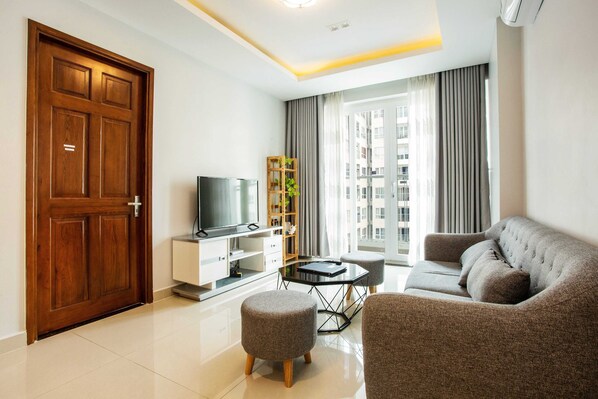 Denne leiligheten ligger i bydelen Tan Binh i Ho Chi Minh-byen. Et par kulturelle høydepunkter er Krigsminnemuseet og Ho Chi Minh-byens operahus, men hvis det er shopping som står på planen, kan du ta turen til Ben Thanh-markedet og Dong Khoi-gaten. Saigon zoologiske og botaniske hage og Dam Sen vannpark er også verdt et besøk.