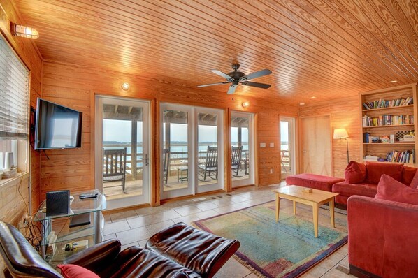 Step inside and feel right at home in the warm, wood-accented living space filled with natural light. The open-concept design features a spacious kitchen and dining area, a built-in bookshelf stocked with vacation reads, and a plush sectional that invites you to kick back and relax. The wall of windows and glass doors draws your gaze straight to the deck and beyond, where rocking chairs overlook the peaceful sound.