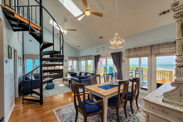 After your tummies get full, walk into the living room area and enjoy the relaxing views of the ocean. Also on this floor is a full bathroom as well as a bedroom with a Queen bed with its own private balcony overlooking the sound side of the house. A spiral staircase leads to the upper floor, where you'll find two bedrooms and a second full bathroom shared between them. Both bedrooms have two twin beds.