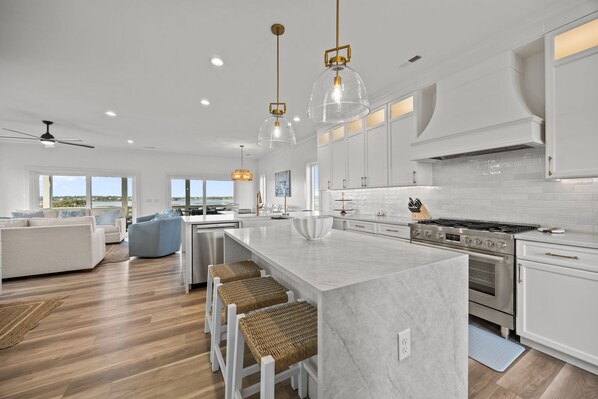 The gourmet kitchen is designed for entertaining large groups and includes a gas range, double ovens, two dishwashers, an oversized island, a coffee bar with Ninja Espresso machine and drip coffee pot, and a wet bar with ice maker. Open-concept living and dining spaces make it easy for everyone to gather together.