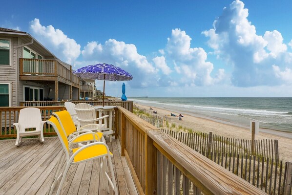 The main level features a bedroom with two twin beds, conveniently located near a full hallway bathroom. Upstairs, the master bedroom is a tranquil retreat with a queen bed, Smart TV, en-suite bathroom, and a private balcony offering stunning beachfront views—perfect for morning coffee or an evening sunset.