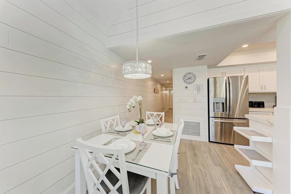 The open-concept living area has been thoughtfully redesigned with modern finishes and coastal-inspired décor. The kitchen features brand-new cabinetry, sleek countertops, and updated appliances, so you can prepare meals with ease. The adjacent living and dining spaces provide a cozy spot to relax or gather after a day in the sun.