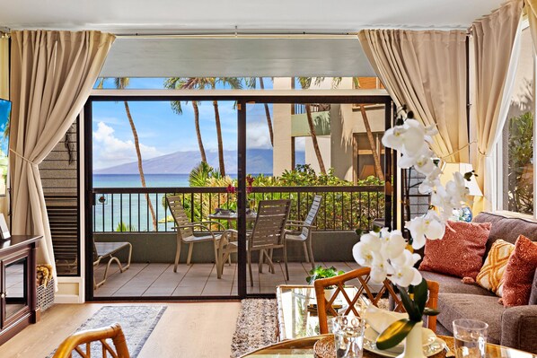 Inside, the condo is designed for comfort and convenience. The living room features a 65" Smart Roku TV, a sofa sleeper, and a dining area, while the fully equipped kitchen has new stainless-steel appliances, an ice maker, filtered water, and all the essentials for preparing meals at home. The bedroom includes a queen bed with Japanese Shoji-style sliding doors for privacy and a 40" Smart Roku TV. The bathroom was fully remodeled in 2020, and for added convenience, there is an in-unit washer and dryer. From the moment you enter the front door, the ocean is in view, creating a true paradise experience.