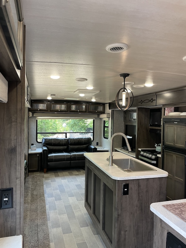 The Sage has a stunning mountain view you can enjoy from the 10'X20' deck which includes a Coleman inflatable 7 person hot tub perfect for outdoor fun. Kitchen is fully stocked with pots, pans and everything you need to cook, 3 burner gas stove/oven, two refrigerator/freezer, K-cup and regular coffee maker and microwave. Open living space offers central AC, dinning area, two recliners and a love seat (folds into a bed), fireplace, blue tooth speaker and Smart TV. The bedroom has a King size bed with plenty of closet storage. The Sage will sleep two-three adults or two adults and two small children. Your fur-babies (pets) are welcome too. All bed linens and towels are provided.