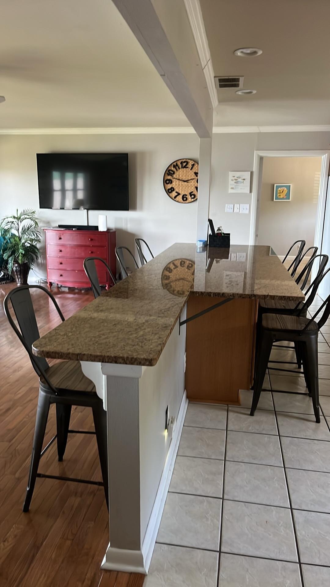 Et romslig kjøkken med en øy åpner opp til hovedområdet. Kjøkkenet er godt utstyrt med service for 10 personer og inkluderer forskjellige ekstra matlagings- / serveringsartikler. Rundt hjørnet finner du et andre oppholdsrom med TV og sovesofa. Generøse sitteplasser er inkludert i begge oppholdsrom, i tillegg til 2 TV-er, DVD-spiller og Chromecast. Hver stue går ut på terrassen. Huset kan sove 10 personer og soverommene ligger nede i hovedgangen. Hovedsoverommet har en king size-seng, soverom 2 har en queen size-seng, soverom 3 har to sett med køyesenger, og den ekstra oppholdsområdet inneholder et minne skum dronning sovesofa. Hjemmet inneholder også to komplette bad med håndklær.