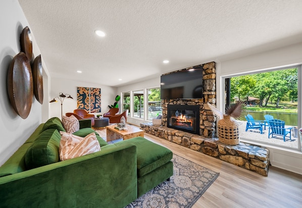 Upon entering, you'll be welcomed into a bright and inviting living space where large windows flood the area with natural light and provide breathtaking views of the lake. The cozy living room, with its plush seating, is perfect for relaxing after a day of exploration or water activities. The heart of the home is the open kitchen, fully equipped with modern appliances, making meal preparation a breeze. The spacious kitchen layout offers plenty of counter space for cooking, and the adjacent dining area comfortably seats your entire group. Additional seating at the kitchen bar makes it a great spot for casual dining or morning coffee, ensuring everyone can gather and enjoy meals together.