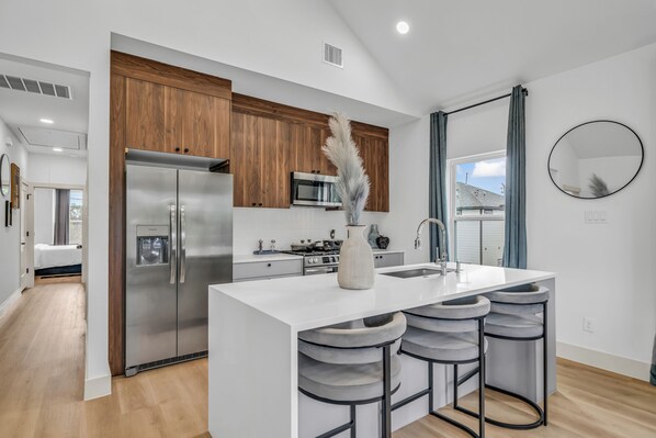 The space The Market St Blue Home features 3 spacious bedrooms and 3 modern bathrooms, making it perfect for families or groups. The living room is cozy yet stylish, with plush seating and a smart TV for entertainment. The kitchen is fully equipped, ideal for cooking meals or enjoying a cup of coffee in the morning. Each bedroom is designed for maximum comfort with luxurious bedding. Bathrooms are equipped with premium towels and toiletries for a relaxing experience.