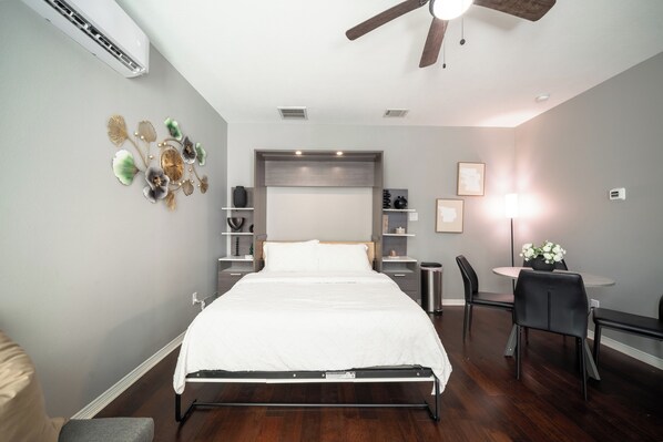 Chic Studio Design : Enjoy a thoughtfully designed studio that maximizes space and comfort, complete with a plush bed, kitchenette, and contemporary decor.