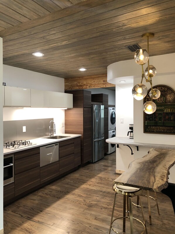 - Fully-equipped kitchen: convection microwave, fridge, dishwasher drawer, and gas cooktop.