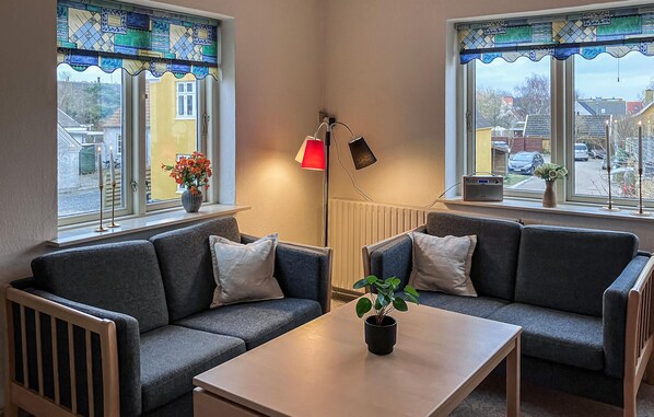 Bli ønsket velkommen av den velholdte innredningen i ferieleiligheten i første etasje. Slå deg ned i den koselige stuen, som innbyr til kos med sine komfortable sofaer og fine detaljer. Bruk sofabordet til en ettermiddagskaffe eller et kortspill. Lag små retter på det kompakte kjøkkenet, slå deg ned i den separate spiseplassen og nyt måltidene sammen ved spisebordet under skråtaket. Les i det varme kveldslyset eller slapp av foran TV-en på slutten av dagen.