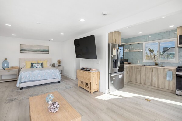 Sunset Surf is a charming studio-style retreat where you'll instantly feel at home. The thoughtfully designed layout offers a fresh coastal vibe and everything you need for comfort and convenience. Unwind in the cozy sleeping nook, which features a plush queen bed and a sleep sofa for extra space. The kitchen is fully equipped for whipping up breakfast before a beach day. A dedicated desk creates the perfect quiet space for remote work, while the chic bathroom features a stylish lighted vanity to make getting ready a breeze. Finally, the private balcony offers the perfect escape—sip your morning coffee with an ocean breeze, relax with a book, or fire up the BBQ as the sun sets over the Pacific. Convenient parking and an in-unit washer & dryer make your stay effortless.