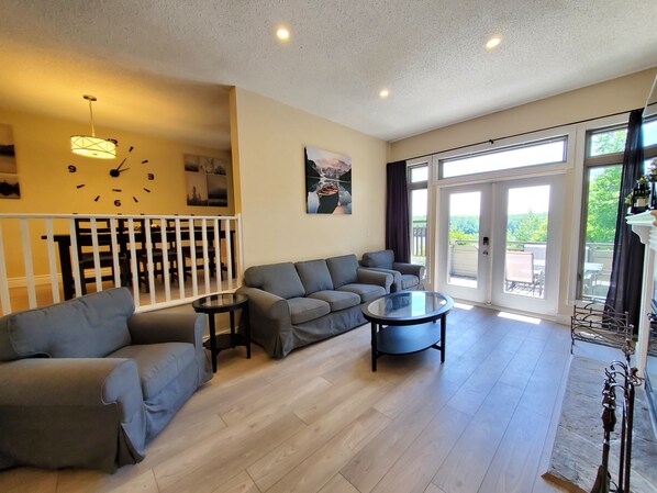 Fully renovated, cozy Muskoka getaway on Fairy Lake, only 2 hours north of the GTA. A gorgeous lakeview condo featuring two walk-out decks. Perfect escape for couples & small families wishing to relax and enjoy year-round activities. The property features a shared swimming dock, scenic hiking trails and close proximity to downtown Huntsville, Deerhurst Resort, Hidden Valley Ski Resort, Arrowhead Park, Algonquin Park. Four nearby lakes offer family friendly beaches, great fishing & water sports. Completely renovated corner unit with a private entrance and free parking. This beautiful 2-bedroom 2 bathroom condo features an open concept kitchen & dining room, cozy living room with a wood burning fireplace, two walk-out decks that offer breathtaking views of the lake, and spacious bedrooms with corner balconies to relax and enjoy the serene setting. Free Gigabit high speed internet is included. Guests can also enjoy 3 flat screen TVs with dozens of HD channels (including full sports package) and complimentary Netflix access, as well as a Google Home system with complimentary access to Spotify Premium.