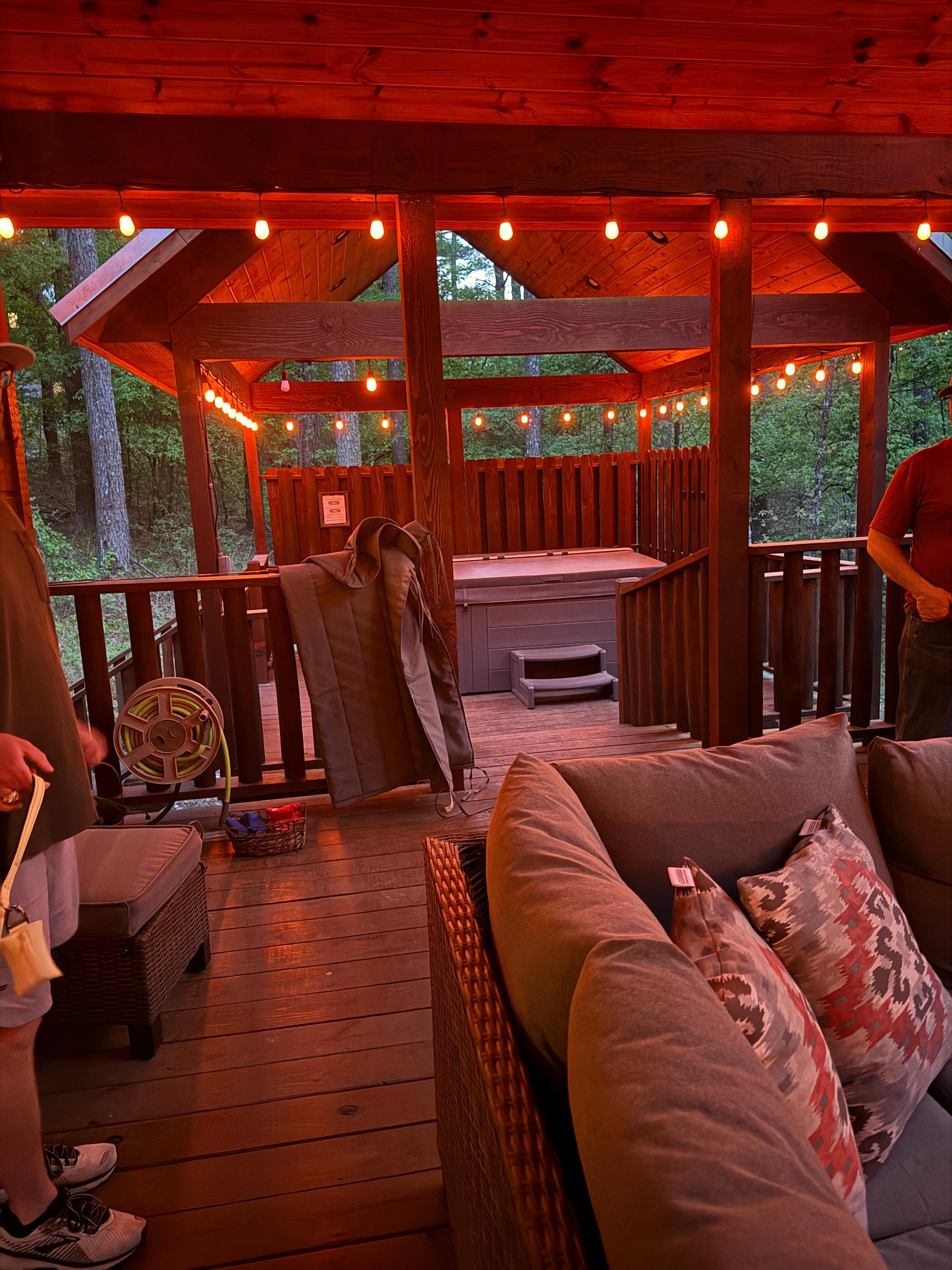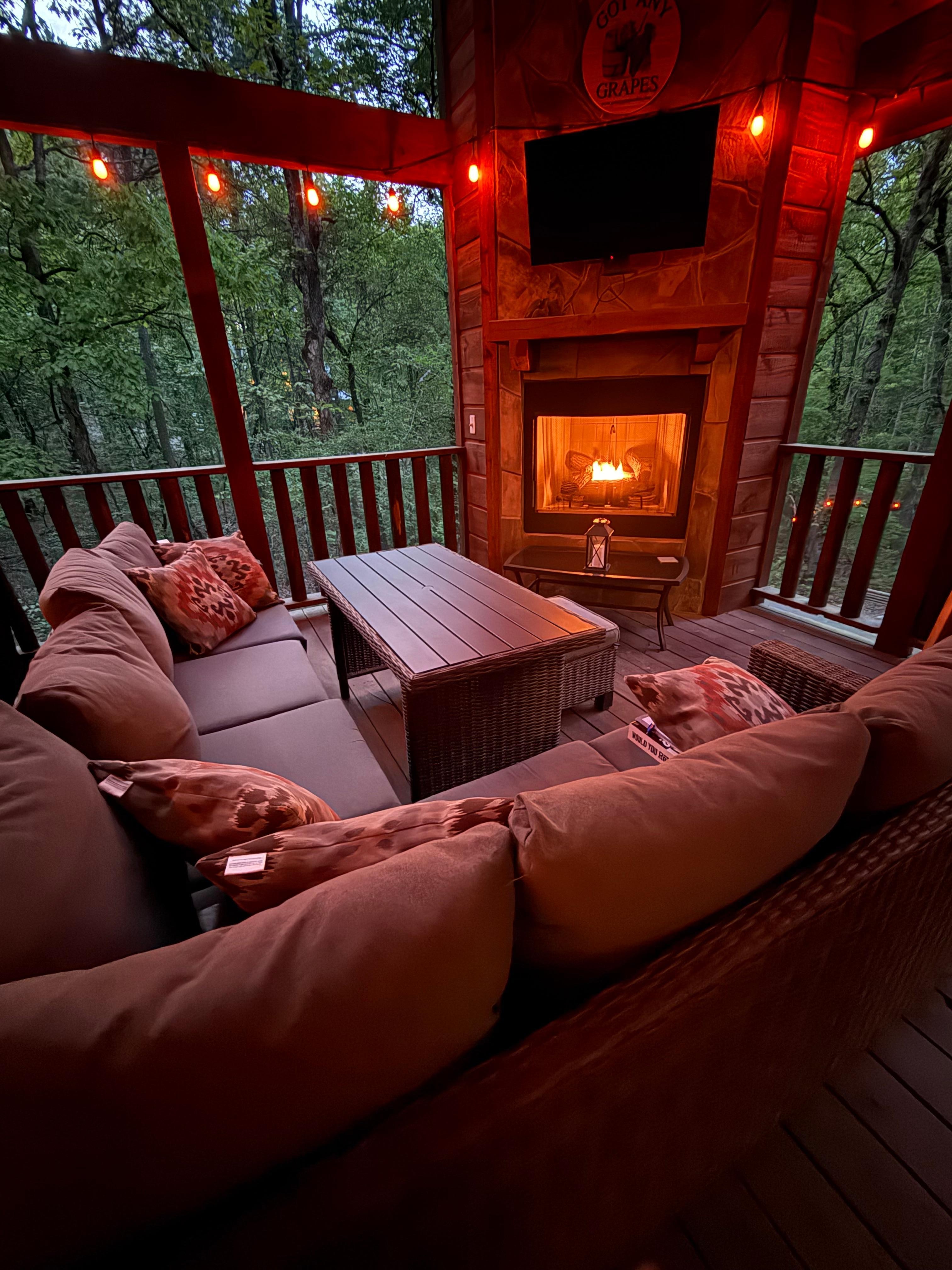 The elevated two-tiered deck allows you to enjoy the peaceful outdoors and wildlife in comfort. Watch your favorite movies outside or stream your songs on the surround sound Bluetooth speaker. Guests will receive a complementary gift of deer feed offering an option for an up close and personal experience of watching deer feeding right from the back deck! The patio includes super comfortable L shape sofa, dining area, infrared barbecue grill, and a fully enclosed private 6-person hot tub with multi-color lighting for enjoyable relaxing evenings any time of the year. Gather in front of the campfire surrounded by soft flickering ambiance lights and experience magical nights gazing at the stars or enjoy soaking in the private hot tub to create some lasting memories with your loved ones.